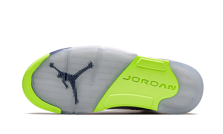 La Air Jordan 5 Retro Alternate Bel-Air sfoggia una tomaia in pelle bianca. Ci sono moltissimi dettagli che richiamano direttamente l’atmosfera degli anni ’90. Il marchio colorato Jumpman sulla linguetta e sul tallone, la fodera tempestata di motivi multicolori forniscono un effetto ultra trendy e originale. La suola viola e la suola Icy completano questo design per un rendering moderno e unico.