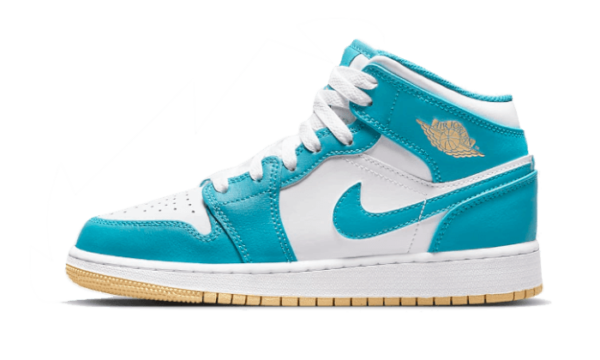 Là Air Jordan 1 Mid Aquatone rivelare una base in pelle bianca, accompagnato da sovrapposizioni in Pelle blu lagon. Troviamo anche un logo Ali Golden on the Flaps, in conformità con la suola.