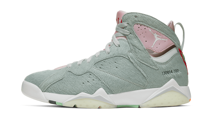 L’ Air Jordan 7 Hare 2.0 presenta una tomaia in ecopelliccia verde pastello, abbinata a inserti che ricordano l’interno rosa delle orecchie di Bugs Bunny. Notiamo il marchio Jordan sulla linguetta e un cenno al colore OG con la scritta “130014-100” apposta sul retro della coppia. La suola multicolore completa il design di questa creazione.
