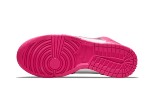 La Nike Dunk High Pink Primesepresenta una tomaia in pelle bianca con sovrapposizioni di pelle rosa fucsia sul tallone e sul parafango. Lo Swoosh e gli occhielli sono rosa, cos come i lacci che contrastano con la lingua bianca. Una suola bianca con una suola rosa fucsia completa il design retr di Peter Moore.