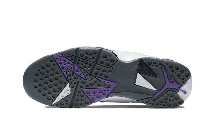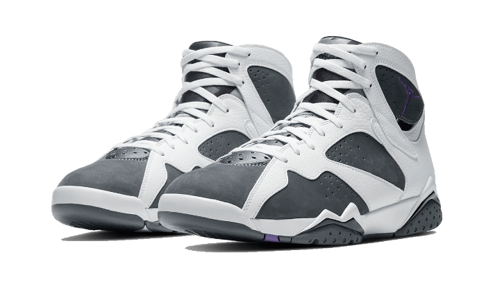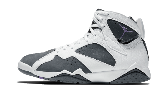 Là Air Jordan 7 Retro Flint (2021) Visualizza una base in Nubuck grigio, abbellito con pannelli in pelle Bianco sugli occhielli e nel quartiere del pannello. C’è anche una pantofola neoprene così come diversi accenti viola sulla suola. UN Jumpman Viola e un numero 23 Aposto sul tallone e mettono in calpesta il tutto.