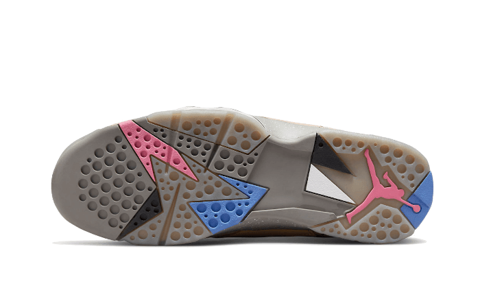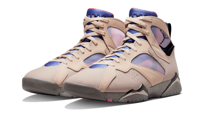 L’ Air Jordan 7 Retro Sapphire presenta una base in nabuk beige con dettagli in mesh semitrasparente che rivelano la tomaia in neoprene rosa e viola . la linguetta blu mostra una tonalità blu che imita lo zaffiro , una pietra preziosa scintillante. Un’intersuola con motivo maculato è accoppiata a una suola multicolore con parti traslucide.