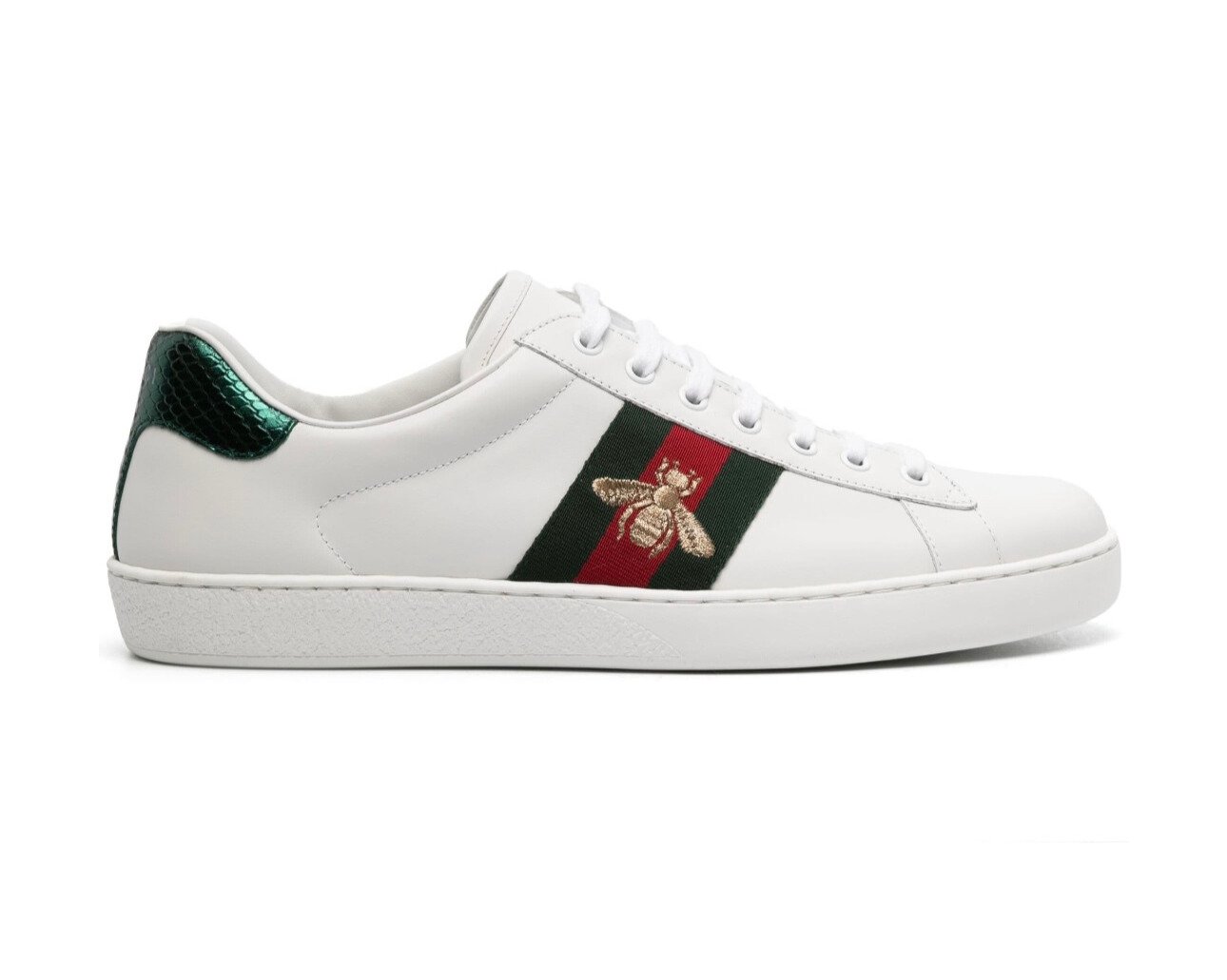 Fin dal suo debutto, l’iconica sneaker Ace si è affermata come caposaldo delle collezioni Gucci. ll design rétro, ispirato da una celebre scarpa Gucci degli anni ’70, viene reinventato e reintrodotto in svariate collezioni. Modello con dettaglio Web e con design a pelle di serpente rossa su un tallone e verde sull’altro.