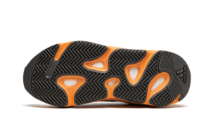 L’Adidas Yeezy 700 Orange Wash ritorna con una base grigia con inserti in camoscio nero e mesh blu-verde. La suola Orange Wash con accenti ovali dello stesso colore contrasta con la suola nera.