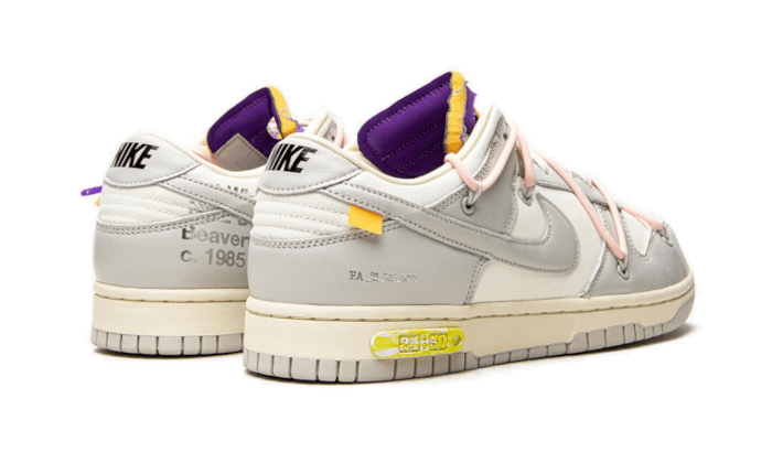 La Nike Off-White Lot 24 presenta una base in pelle e tela, combinando i toni del grigio e del crema. Gli elementi di dettaglio includono sovrapposizioni rosa, fascetta e linguetta viola