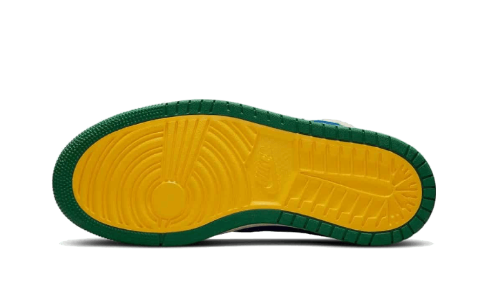 IlAir Jordan 1 High Zoom CMFT Califia Aleali May presenta una costruzione in pelle e un color-blockblu reale e verde abete. Alcuni elementi, come lo Swoosh e il collare della caviglia, sono fatti di un materiale satinato, che aggiunge un tocco alla moda. Per quanto riguarda le ali, in ciniglia beige, aggiungono rilievo e fanno eco alla lingua dello stesso colore. Infine, notiamo la firma del designer sulla zona dell’allacciatura.